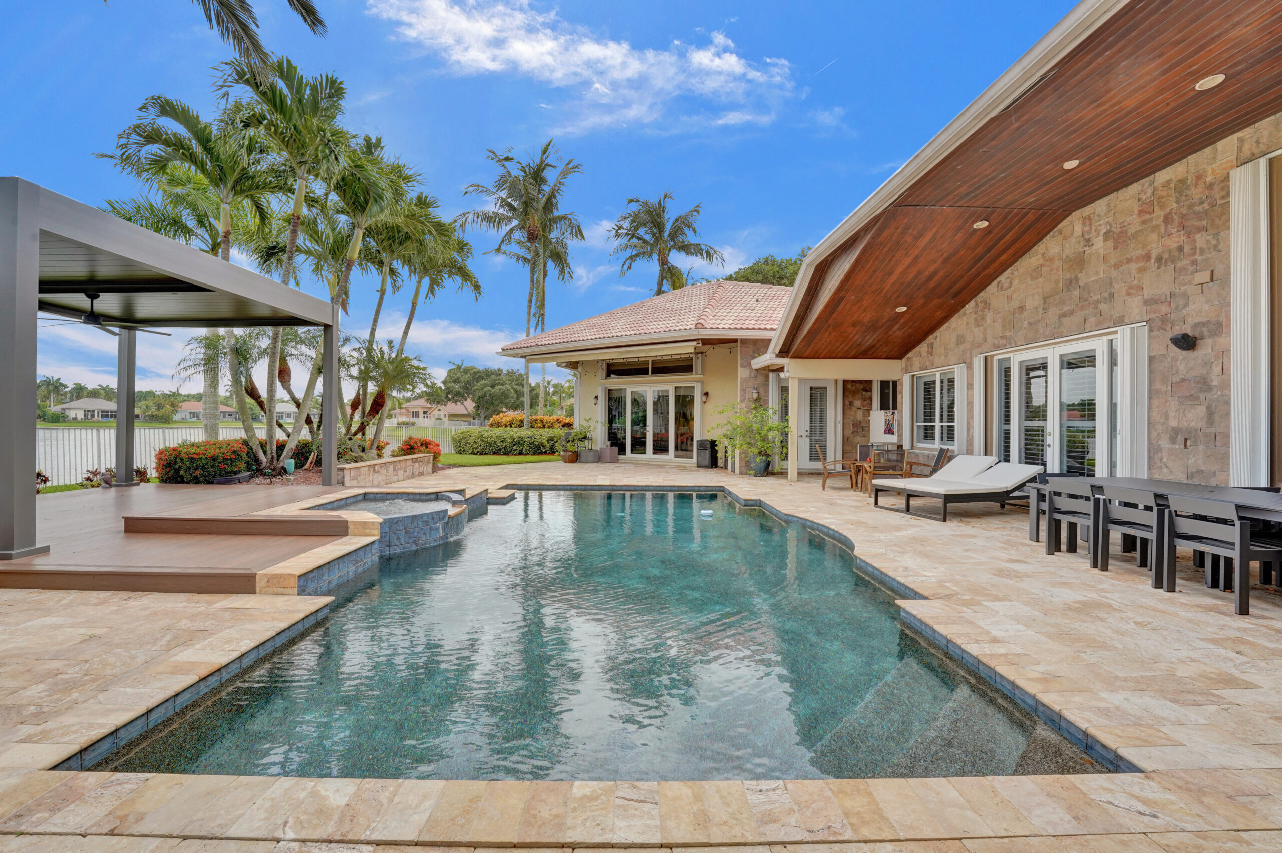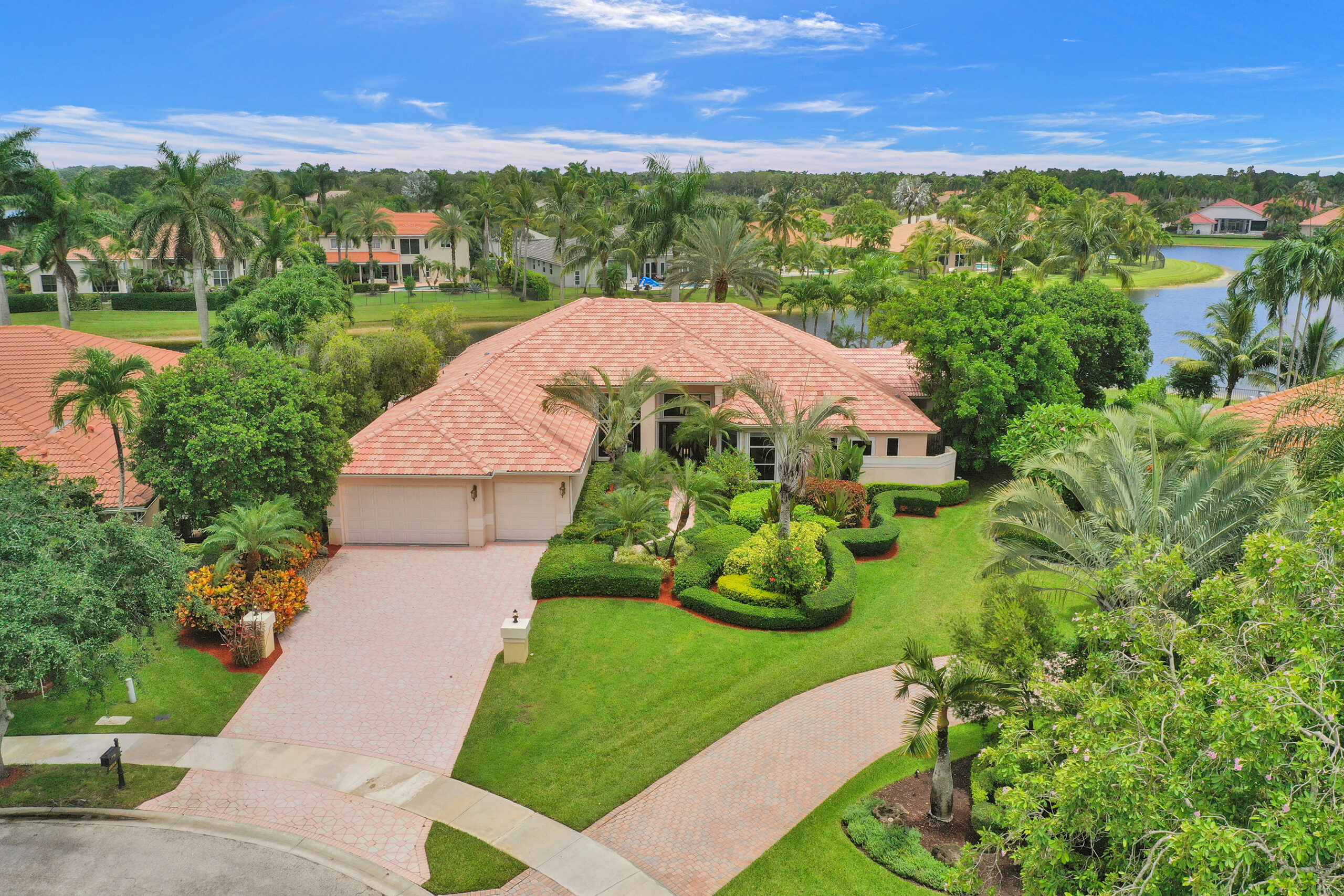 We are pleased to present this rarely available home in WHCC with huge 1/1 Guest House on over 1/2 acre waterfront point lot! This was built by Issa and is one of the largest one-story homes in WHCC with over 6500 sf total area and 6 bedrooms and 4 bathrooms in main house. Home is located in a cul-de-sac with 3 car garage and driveway for multiple cars. Home has a beautiful open split floor plan with high ceilings and views of lake from all main areas. Kitchen w/ granite, wolf & Viking appliances, real hardwood flooring and beautifully updated bathrooms, accordion shutters etc. Only a few homes with this large guest house with views of lake. Absolutely stunning remodeled outdoor pool area with tumbled marble pavers and gorgeous wide lake views. Bring all offers!!